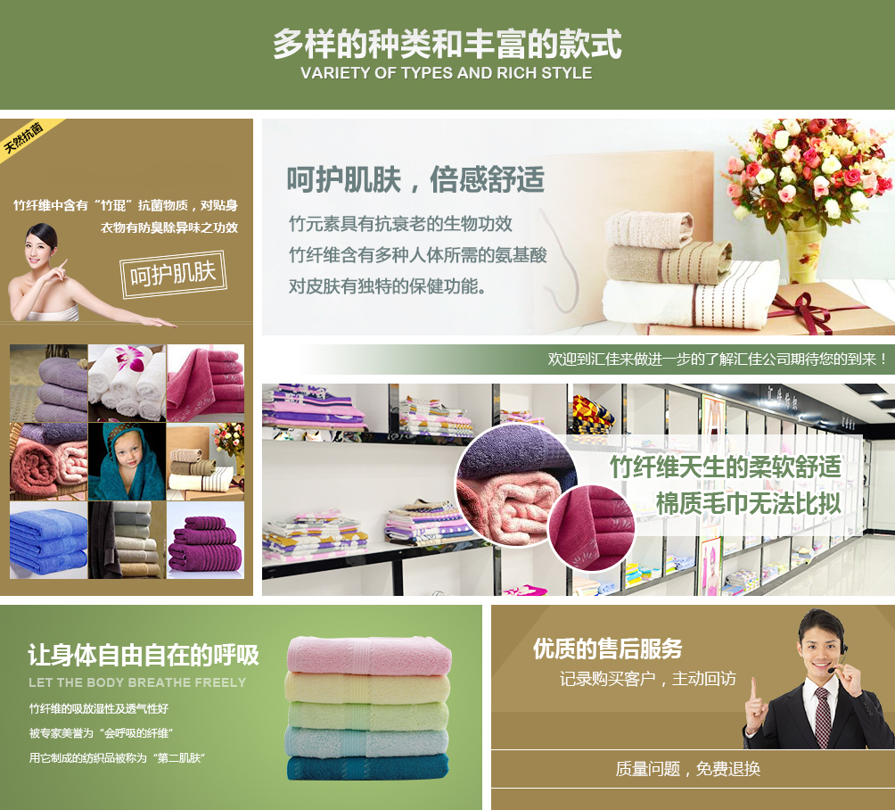 德州匯佳紡織品有限公司專業(yè)生產(chǎn)竹纖維毛巾,是竹纖維毛巾品牌廠家,并且提供竹纖維毛巾禮盒套裝用于福利和禮品。公司座落于山東德州,交通十分便利,公司近臨京滬高速公路,距離德州火車站、汽車站10公里京滬高鐵5公里,濟(jì)南國際機(jī)場120公里。